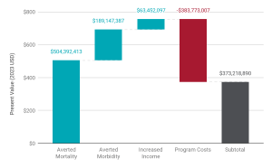 Limestone delivered a final report to synthesize its analysis, highlighting the scope of the investments in partnership with the World Food Programme (more than 8.5 million individuals reached), the disability-adjusted life years (DALYs) averted and cases of mortality averted, and the cumulative and net social benefits of these investments. Limestone’s analysis estimated the net social return on WVC’s food security and nutrition programming at more than $373 million (USD), yielding $1.97 in social benefits for every $1.00 invested.
